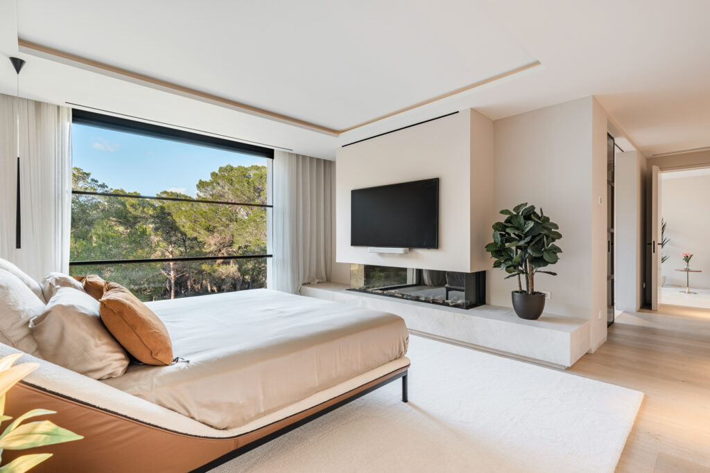 Stellen Sie sich in den Schlafzimmern elektrische Fenster vor, die mit einem sanften Fingerdruck zu einer eleganten Brüstung runterschnurren, auf der Sie die Arme ablegen können, während Sie in die Naturzone schauen und die würzige mediterrane Luft einatmen.